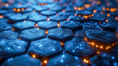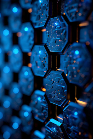 A detailed close-up showcases a series of illuminated hexagonal patterns with vibrant blue lighting..