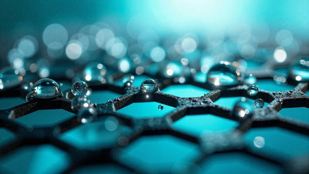 Iridescent hexagonal lattice structure, possibly representing nanotechnology or graphene, covered in small water droplets against a dark blue background. abstract 3D visualization.