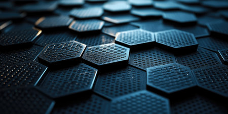 This abstract background features a dynamic hexagonal pattern crafted with a dark carbon fiber texture, exuding a lightweight yet high-performance appeal. The sleek geometric details create a sense of technical precision, making it an ideal backdrop for various modern applications. The subtle play of light enhances the intricate surface, providing a visually striking element that embodies an ultra-modern style suitable for digital designs and technology themes.