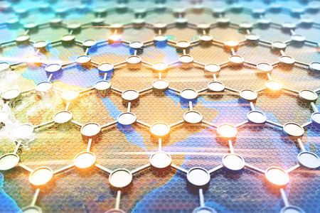White hexagonal mesh over world map background. Concept of connection and global world. 3d rendering toned image