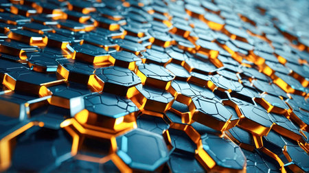 Blue and orange glowing hexagon honeycomb technology or science background template, 3D illustration