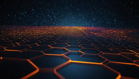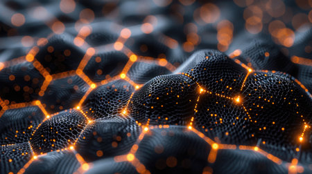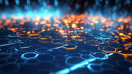 Abstract Futuristic Neural Network with Glowing Hexagonal Patterns and Orange Lights