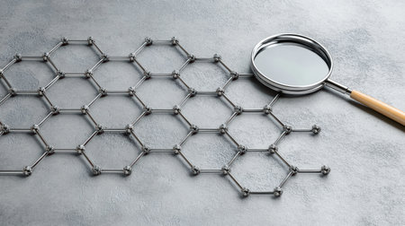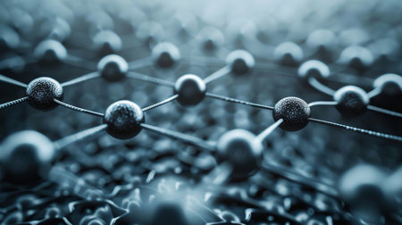A detailed view of multiple metal balls and chains arranged closely together, Graphene, one atom thick, under a powerful microscale lens, AI Generated