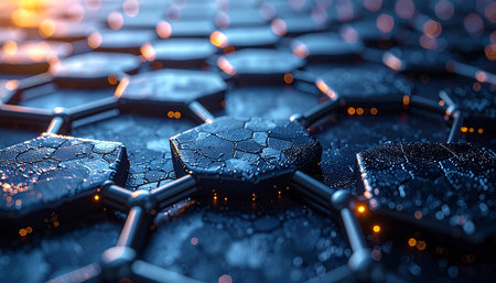 Close-up view of a futuristic graphene-inspired nanostructure glowing with energy, symbolizing advanced materials, nanotechnology, scientific innovation, and the future of high-tech research.