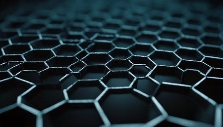 A detailed macro view of a repeating hexagonal atomic lattice structure with a metallic sheen and subtle blue tones.