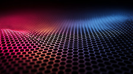 This abstract honeycomb background features a stunning play of colors with soft lighting, perfect for modern design themes and technology contexts.