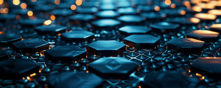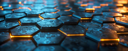 A sleek, futuristic metal surface with hexagonal patterns and a glowing blue underlay, giving it a high-tech, sci-fi feel.