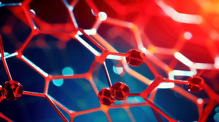 This striking abstract image features a close-up view of a hexagonal grid illuminated by glowing red nodes, evoking a futuristic and scientific atmosphere.