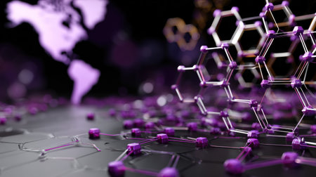 This stunning abstract illustration portrays molecular structures combined with hexagonal patterns and rich purple tones, creating a futuristic digital atmosphere.