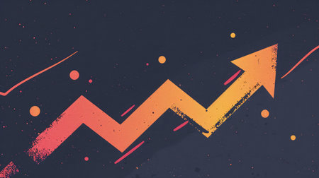 A red and orange upward arrow is positioned against a dark textured surface, symbolizing growth and success in business strategies. The design reflects optimism and positive trends.
