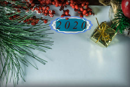 The inscription 2020 is bright and 2019 is dim, a sign of the outgoing year. New Year and Christmas, from behind blurred dots of light on a blue background and red balls on the Christmas tree. Christmas and holiday