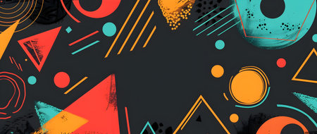 Vibrant collection of dynamic geometric doodle design elements including triangles circles and lines in a modern chromatic color scheme on a dark abstract background perfect for brochure banner
