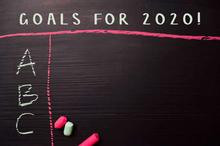 Goals For 2020! written with color chalk. Supported by an additional services. Blackboard concept