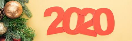 top view of paper 2020 numbers near christmas tree branch with baubles on yellow background, panoramic shot
