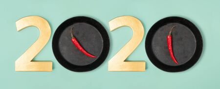 2020 eve top view new year number and pans with hot chillie pepperes as zero numbers. Flat lay style on neon mint background.