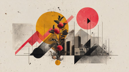 Geometric shapes blend with vibrant floral patterns in minimalist collage art