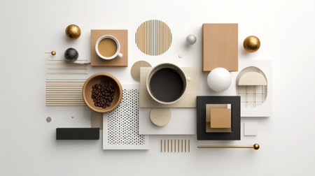 A modern minimalist composition showcasing a variety of textures and shapes, including coffee, wood, and decorative items, against a bright, neutral backdrop.