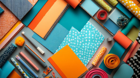 An organized creative workspace featuring colorful swatches, sketches, and design tools, perfect for artists and designers seeking inspiration and productivity.