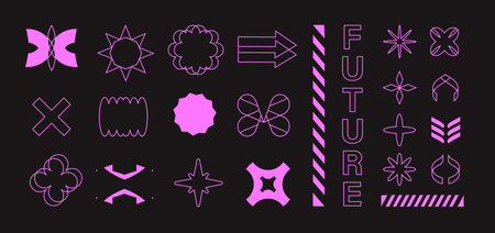 Retrofuturistic geometry design elements collection. Cyber neo futuristic style 80s 90s glitch brutalism shapes, abstract minimalist geometric elements. Minimalist symbols and objects in y2k style.