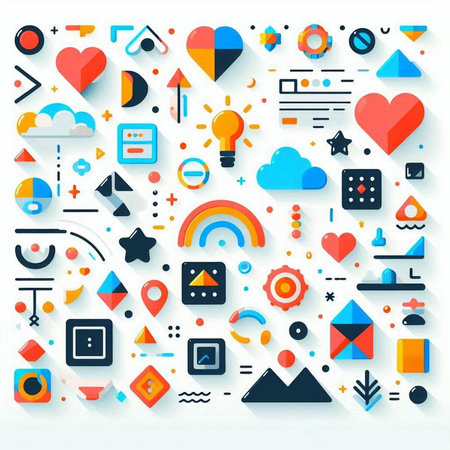 A dynamic arrangement of various geometric shapes and symbols in red, blue, and black colors creates an engaging visual experience. The background is light and enhances the vibrant elements.