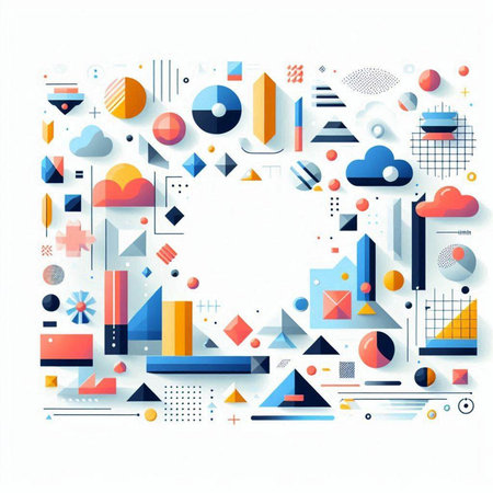 This vibrant abstract composition features a variety of geometric shapes and data visuals. Ideal for projects focused on analytics, modern design, and creativity.