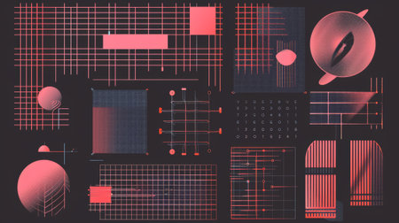 A vibrant arrangement of geometric shapes and design elements on a grid background, ideal for creative projects, modern design concepts, and artistic inspiration.
