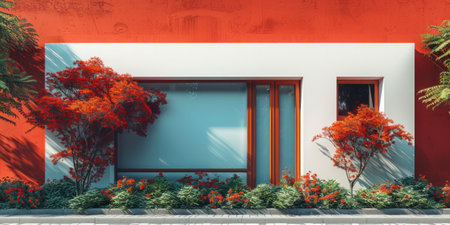 Modern house exterior with vibrant red wall, minimalist windows, and lush landscaping featuring red flowers and small trees.