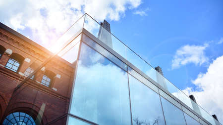 Modern building in the city with sunlight. Glass wall of an office building in the sunlight. Office building window close up with sunrise, reflection and perspective.