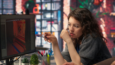 Professional photo editor retouching photos on editing software program on computer with graphic tablet at her workplace