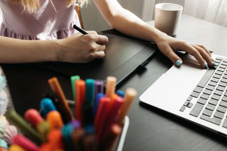 Close up view of female graphic designer working on drawing tablet with stylus pen on office desk