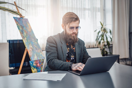 Portrait of a stylish computer programmer wearing custom stylish clothing with sunglasses. Man working on laptop at home.