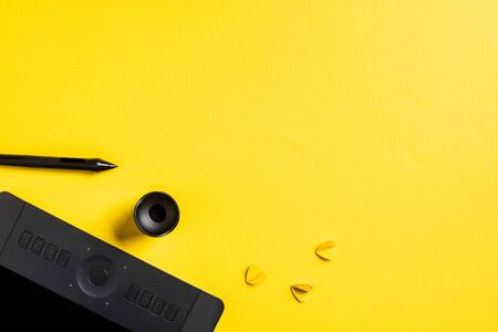 Close up view of color swatches, graphics tablet and color pencils on yellow surface