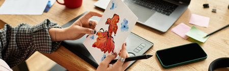 Young woman focuses on her artistic project while working remotely, banner