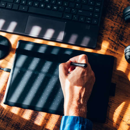 Artist drawing Sketch on Graphic Tablet Top View