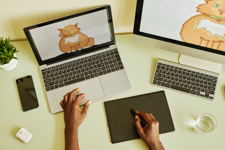 Above angle of hands of young black man holding stylus over graphic tablet while drawing fat fluffy ginger cat by workplace in office