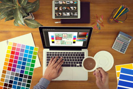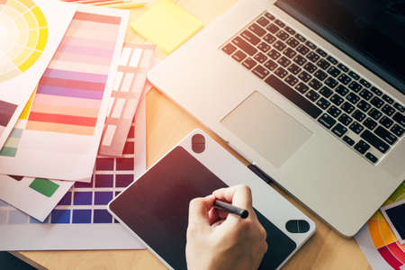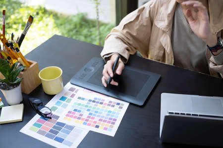 Creative Designer Graphic at work. Color swatch samples, Illustrator Graphic designer working digital tablet and computer