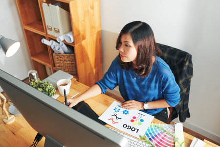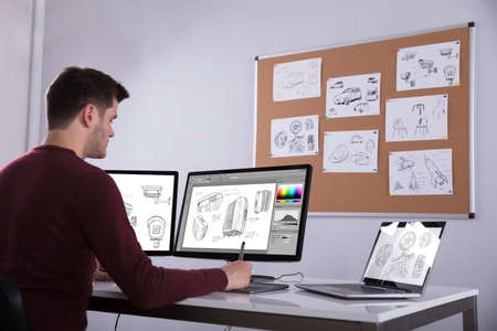 Asian male graphic designer working on computer drawing sketches design. The concept of a new brand. Professional creative occupation with idea.