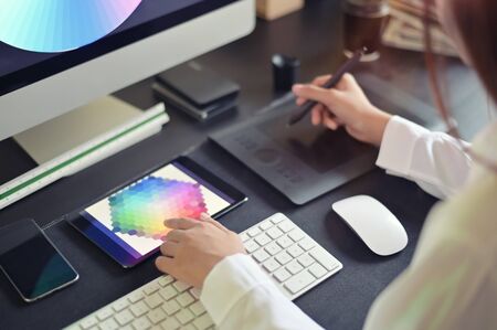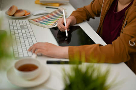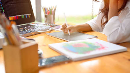 Cropped image, Female graphic designer busy working at her office desk, using digital graphic tablet and computer.