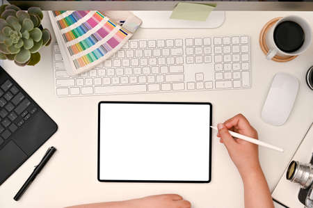Modern graphic designer workspace top view, flat lay, with a female using stylus pen drawing on digital tablet screen. Tablet white screen mockup.
