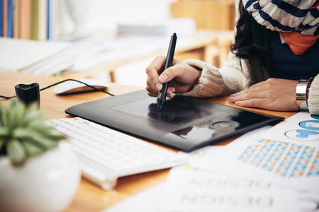 Hands of graphic designer using on graphic tablet when drawing logotype for client