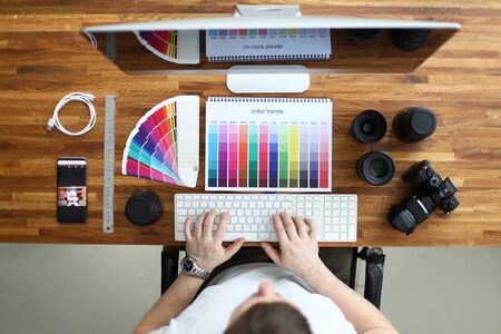Image of male creative graphic designer working on color selection and drawing on graphics tablet at workplace with work tools and accessories.