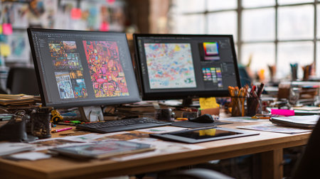 Modern graphic designer messy office showcases creativity and technology generated by artificial intelligence