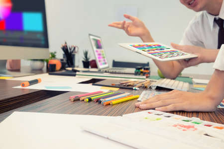 Creative team planning and meeting select color for working designer team concept.