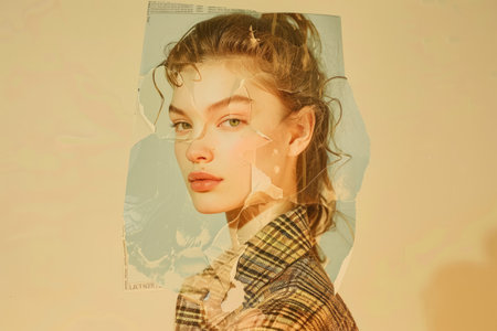 Generative AI, grunge collage poster with beautiful model portrait photo. Different paper magazine pieces composition