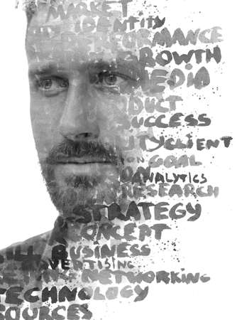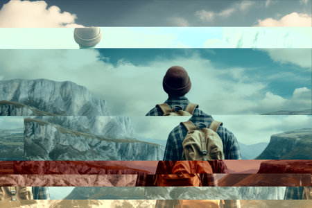 Double exposure portrait of a man combined with a digital image of a mountain landscape