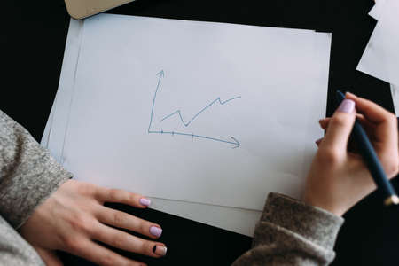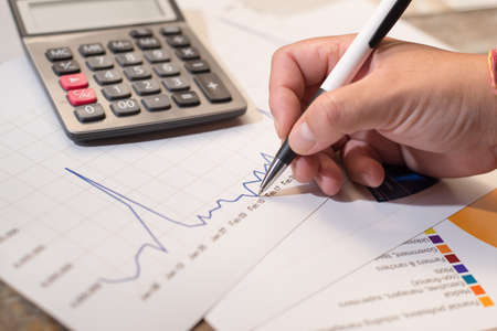The hands of a female business brokerage are planning business investments by analyzing and calculating the stock market to find market profits.