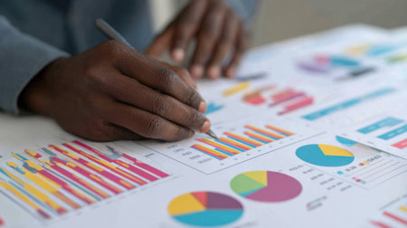 business analysis and statistics concept, desk with mixed graphs and charts on clipboard