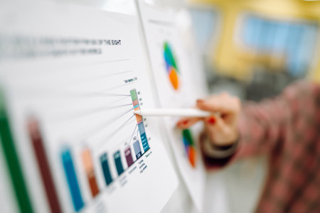 Business woman hands analyze diagram graph show financial charts information in office table. Close up female executive explaining presenting marketing data on conference. Corporate analysis concept.