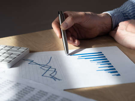 Businessman reviewing data in financial charts and graphs. Male hands holding documents with statistics information. Accounting concept.