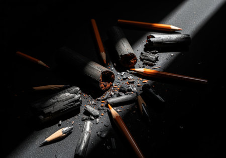 Broken charcoal sticks and drawing pencils scattered on a dark, textured surface, dramatically lit by a strong beam of light, symbolizing fine art, drawing, and creative process.
